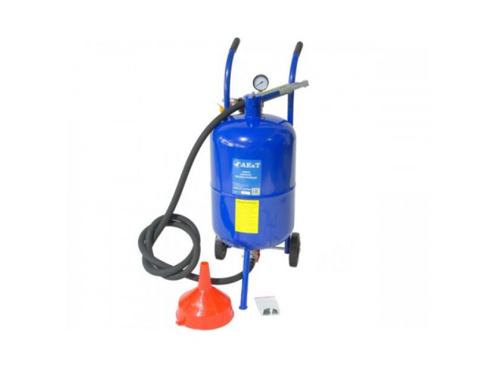 Аппарат пескоструйный T06510 AE&T напорного типа с резервуаром емкостью 38л оборудован керамическим соплом и запорным клапаном, манометром, 2.5м шлангом, воронкой, влагоотделителем, 6" резиновыми колесами.