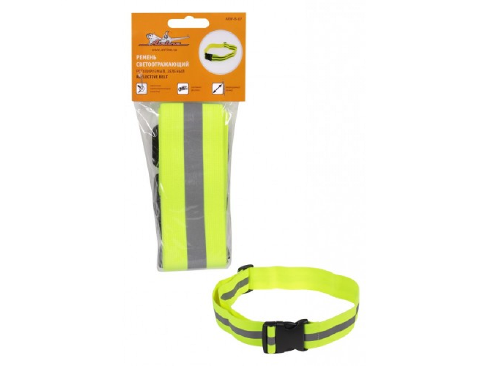 Ремень на пояс со световозращающим элементом в виде центральной полоски. Изготовлен из широкой резинки с регулируемой пряжкой-бегунком и застежкой фастексом. Крепиться на поясе человека для улучшения видимости на дальнем расстоянии в темное время суток.